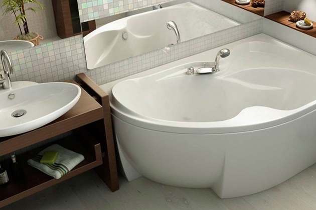 Треугольные ванны по своей форме скорее близки к трапеции. Их изготавливают с прямым углом при вершине — для удобной установки в угол комнаты — коротким выступом в «ножной» части и плавно опадающей фронтальной линией. Фронт может быть как сглаженным (криволинейным), так и строго прямым.