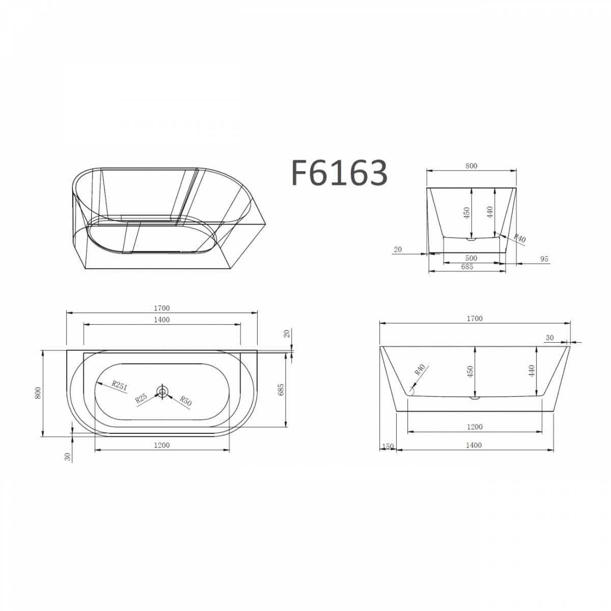 Ванна акриловая Frank F6163 12530 170*80 см (белый)