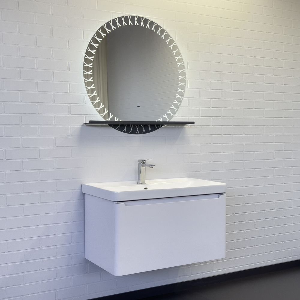 Зеркальное высококачественное полотно с амальгамой на основе серебра. Круглое зеркало для ванной по периметру украшено орнаментом. В нижней части удобная металлическая полка цвета графит для размещения принадлежностей для умывания. Зеркало оборудовано ореольной и фронтальной LED подсветкой бесконтактным выключателем со встроенной функцией регулировки яркости. Температура подсветки 6000-6500K холодный свет.