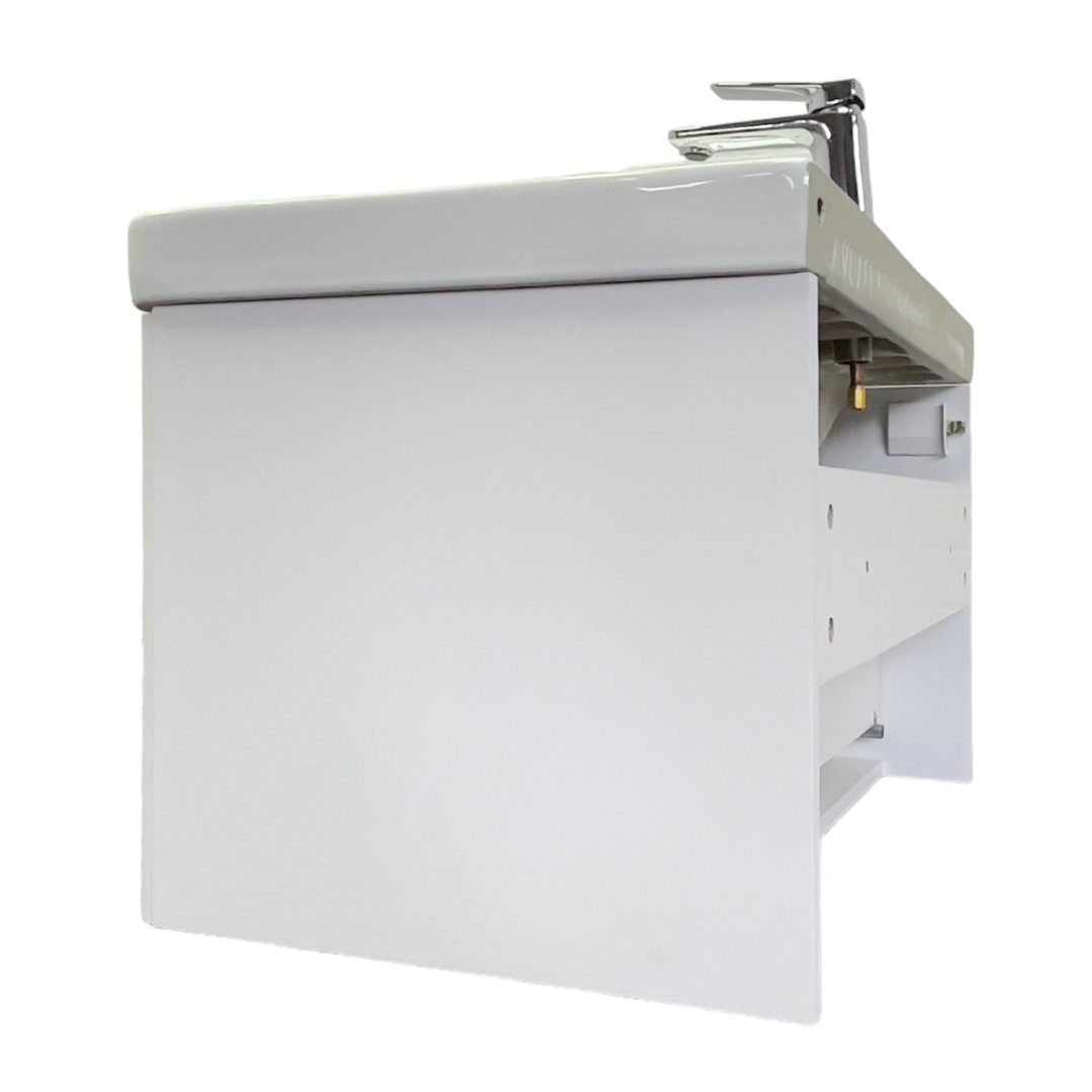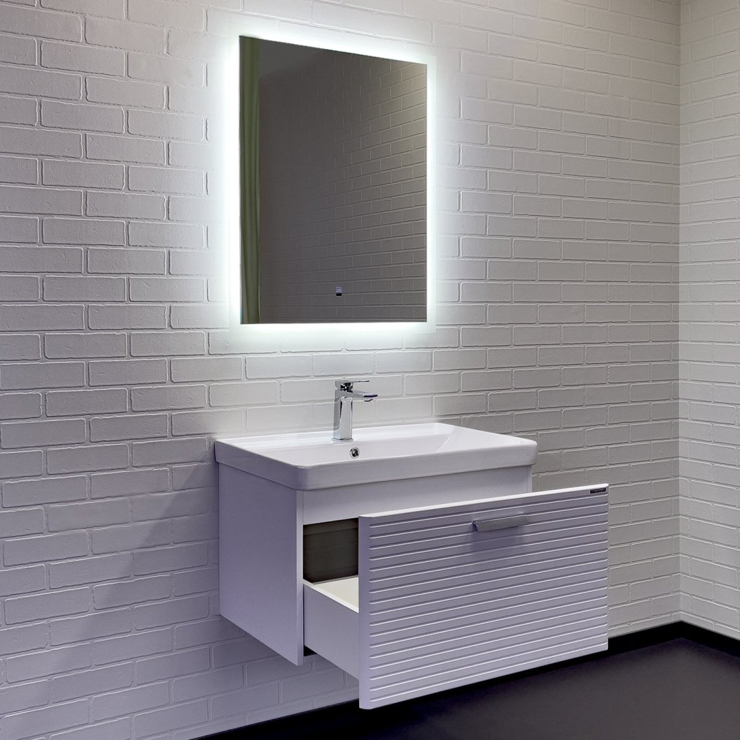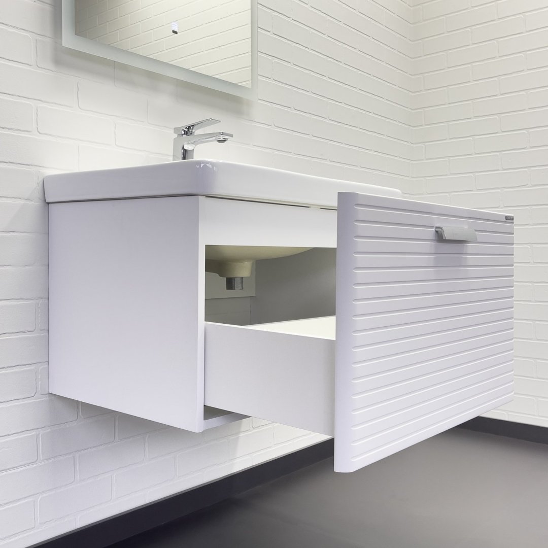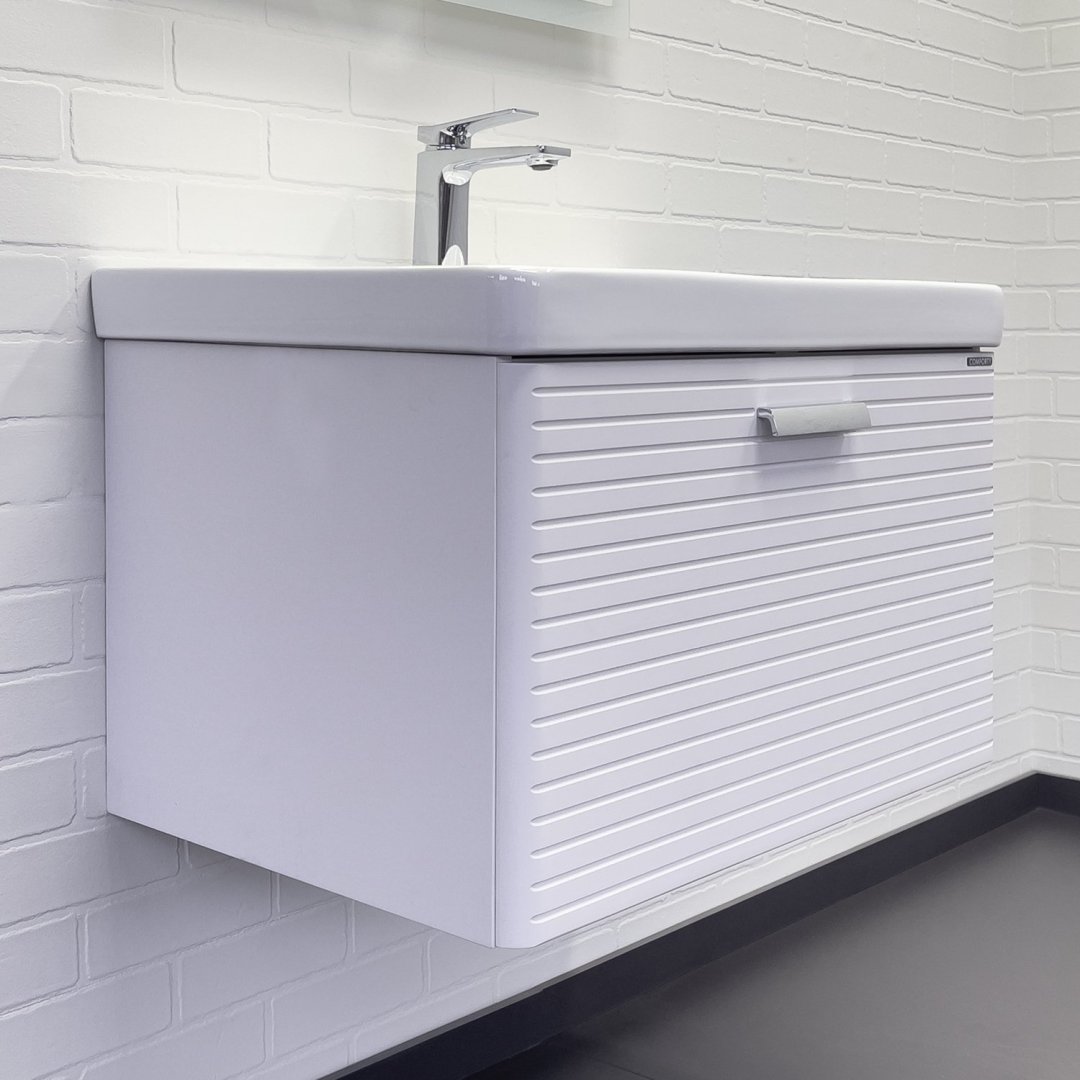 Подвесная тумба с одним большим выдвижным ящиком оснащенным направляющими с системой плавного закрывания. Оригинальные эргономичные ручки цвета хром. Фасады тумбы изготовлены из МДФ, фрезерованы горизонтальным узором и облицованы белой матовой пленкой. Тумба подготовлена для подключения водоснабжения снизу и сзади.