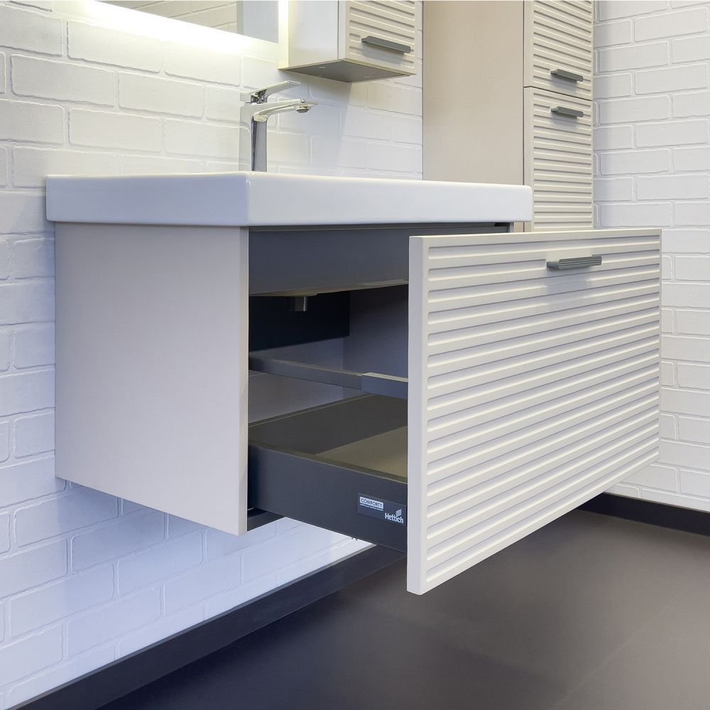Подвесная тумба с одним большим выкатным ящиком c направляющими оборудованными системой плавного закрывания. Корпус тумбы изготовлены из влагостойкого ЛДСП. Фасад тумбы из МДФ фрезерован горизонтальным узором и обтянут в пленку цвета "серый шёлк". Тумба подготовлена для подключения водоснабжения снизу и сзади.