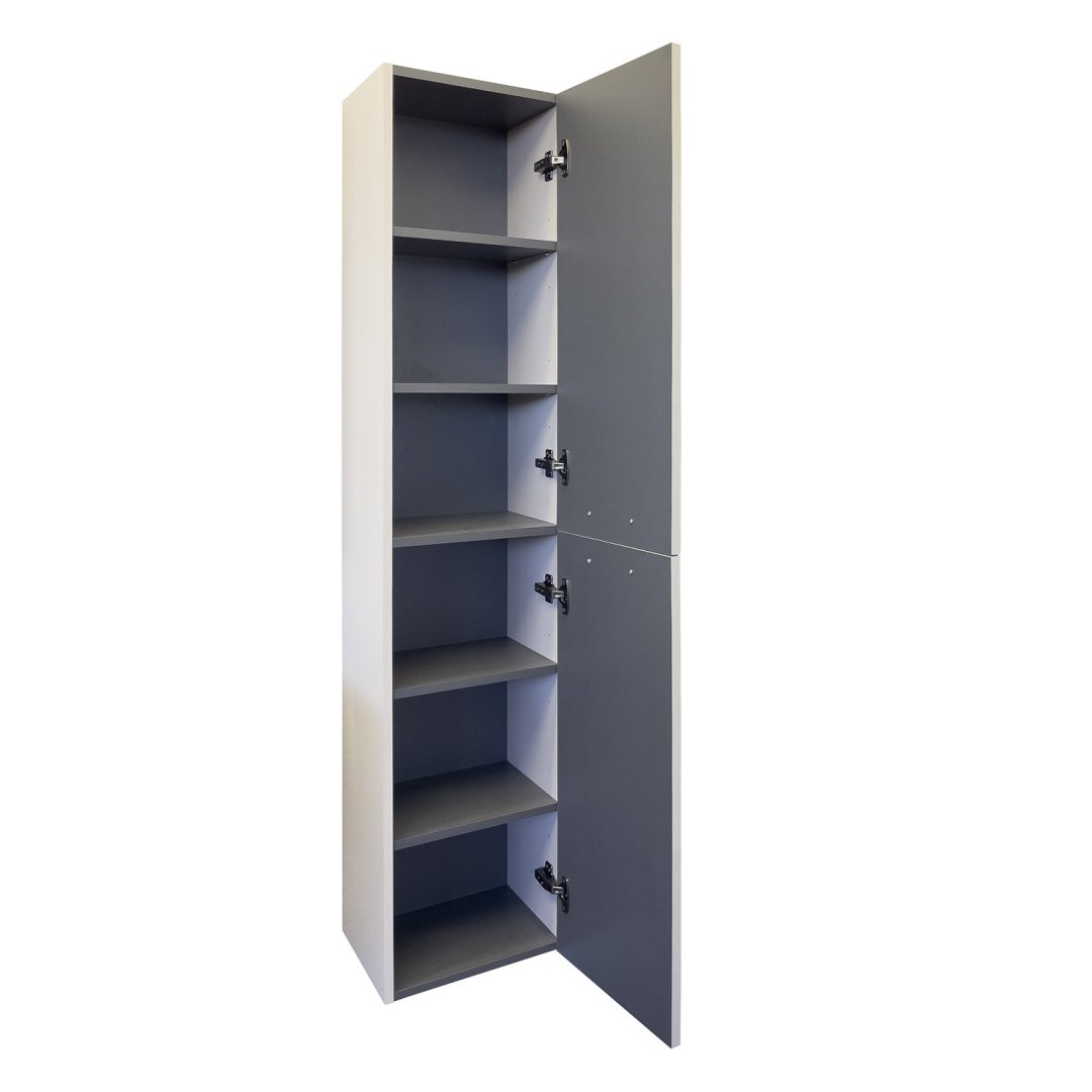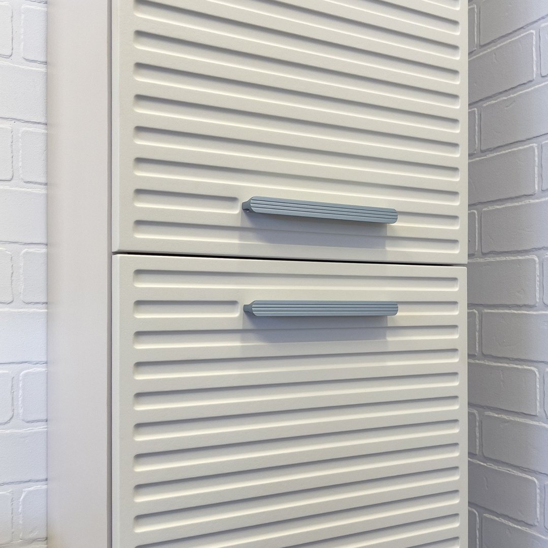 Подвесная шкаф колонна с двумя створками. Створки оснащены петлями с плавным закрыванием и серыми матовыми алюминиевыми ручками. Корпус шкаф-колонны изготовлены из влагостойкого ЛДСП. Фасад пенала из МДФ фрезерован горизонтальным узором и обтянут в пленку цвета "серый шёлк". Шкаф-колонна универсальна, фасады могут быть установлены как с левой, так и с правой стороны.