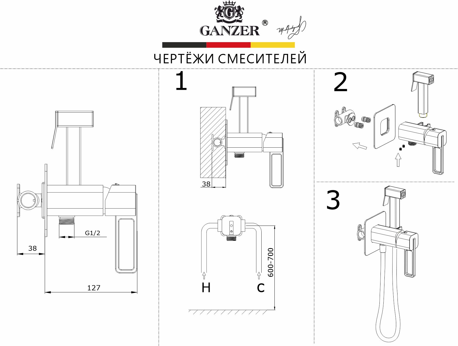 • Встраиваемый смеситель с гигиеническим душем Ganzer GZ12157 хром
