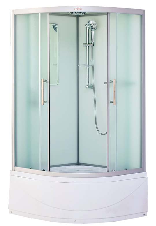 Высокий поддон. Сифон с гидрозатвором. Стекло: 5 мм, переднее - "матовое". заднее - "белое крашеное". Комплектующие: большое овальное зеркало с фацетом, полочка со стаканчиком, смеситель, 3-х режимная душевая лейка на стойке, мыльница, двойные ролики. Модель "СRB" - угловая кабина с высоким поддоном, стеклянной крышей, верхним душем с прорезиненными соплами и вентиляционным отверстием.